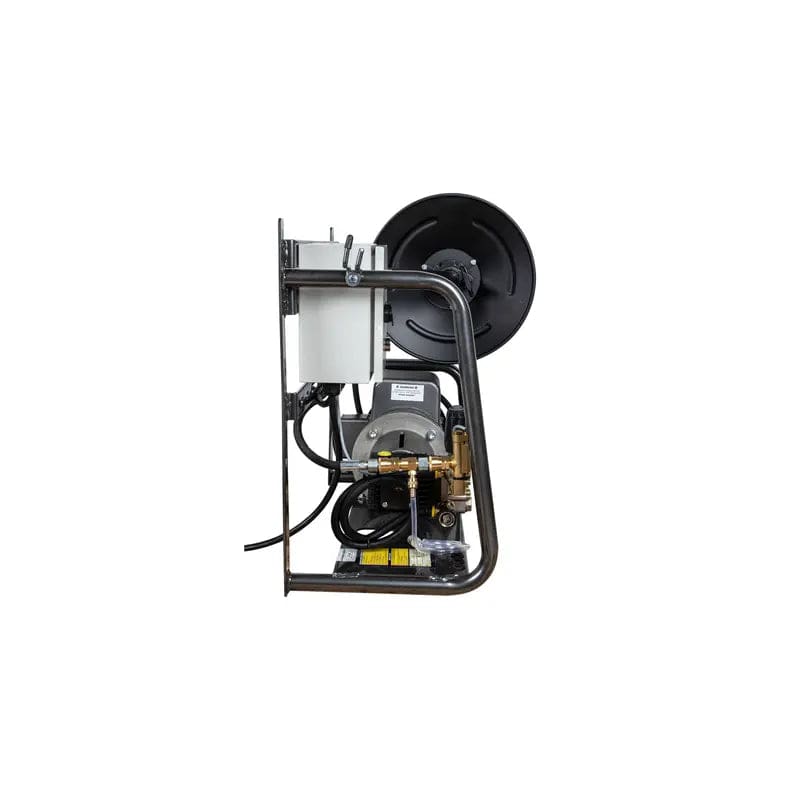 Powder coated steel frame mounts securely to a wall with storage for accessories including a hose reel for the high pressure hose.