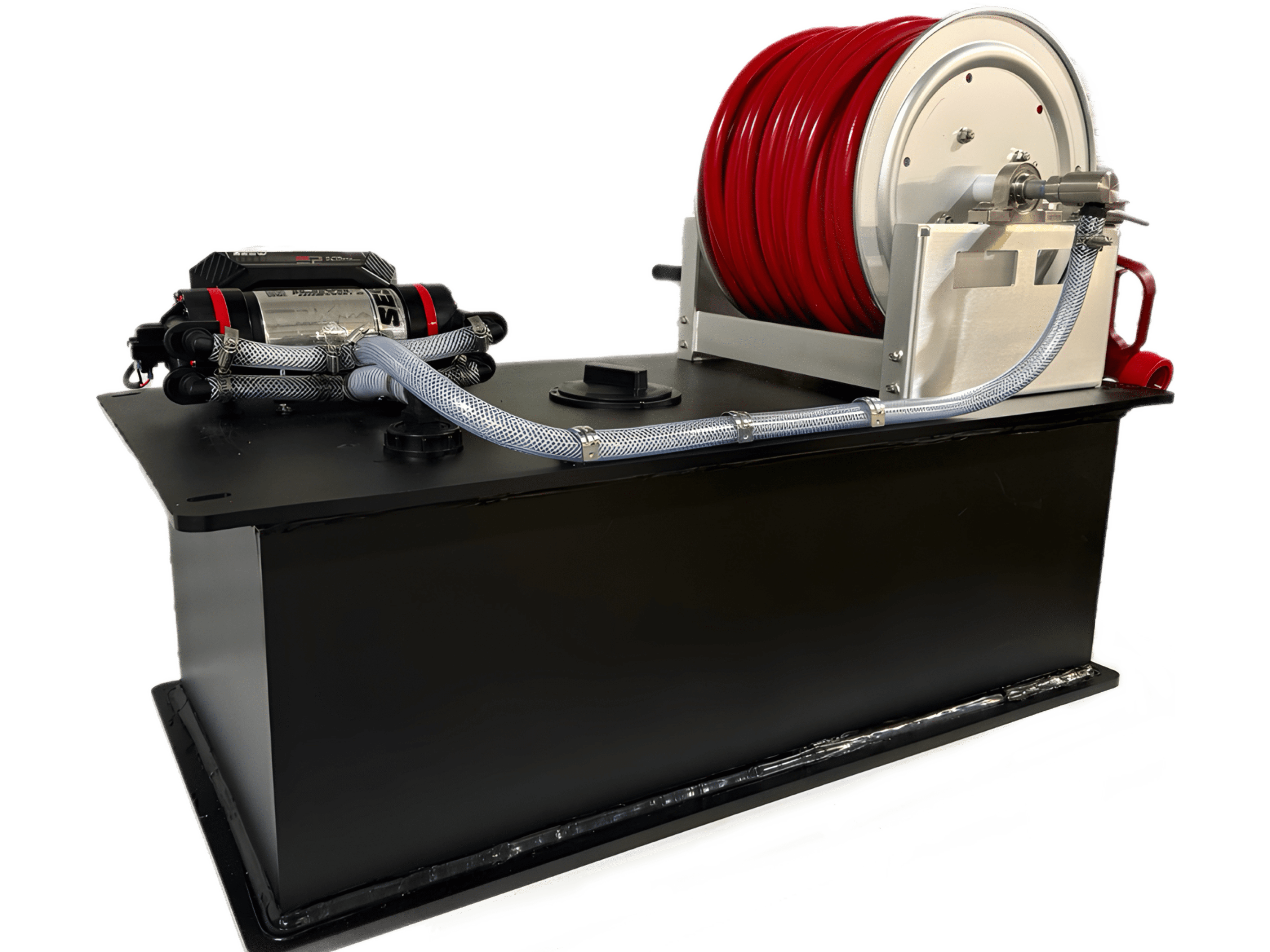 Unit comes with a 45 gallon tank, Super 8 or Sweet 16 soft-wash pump, hose, trigger gun, and REEL DEAL hose reel.