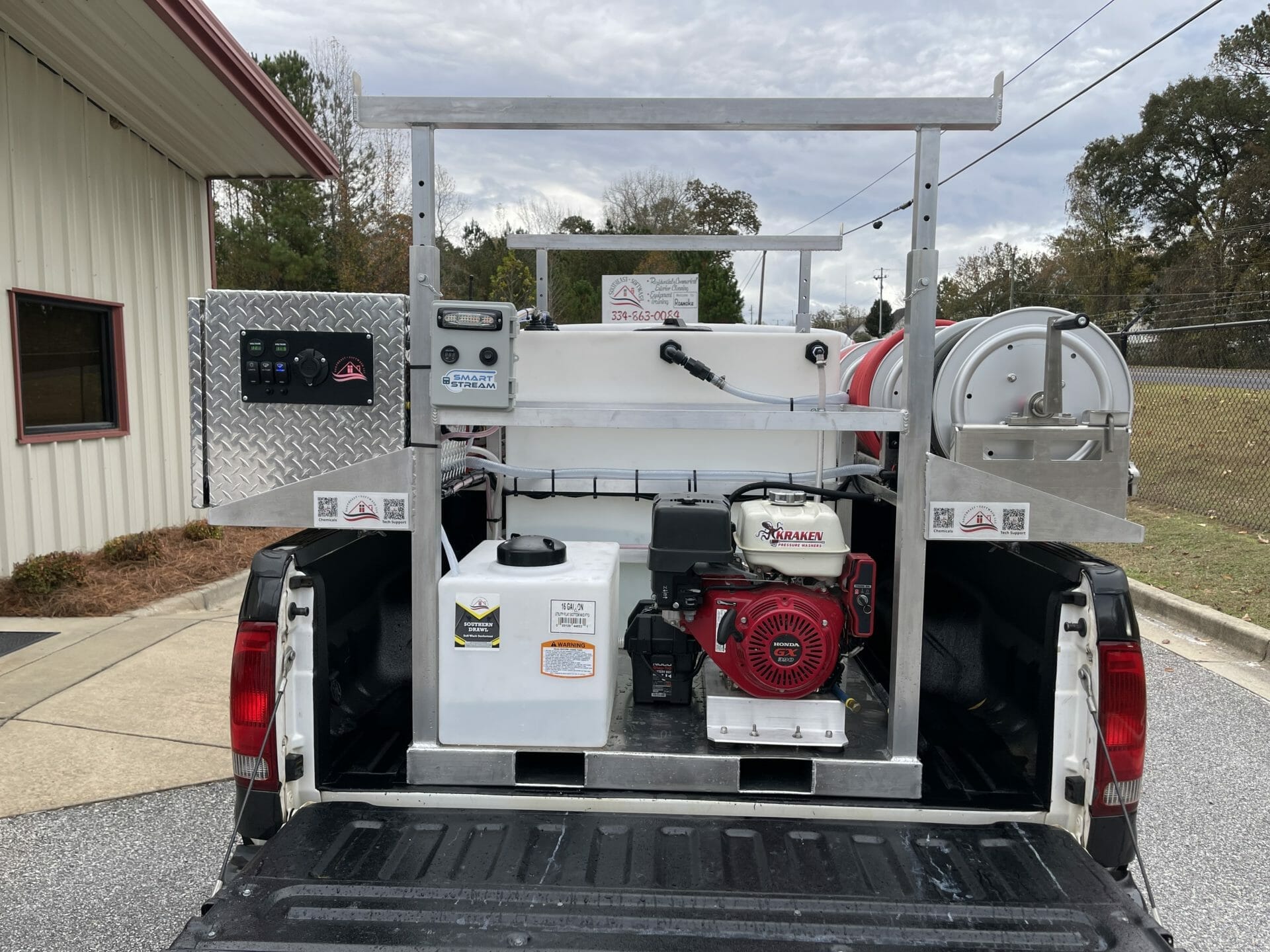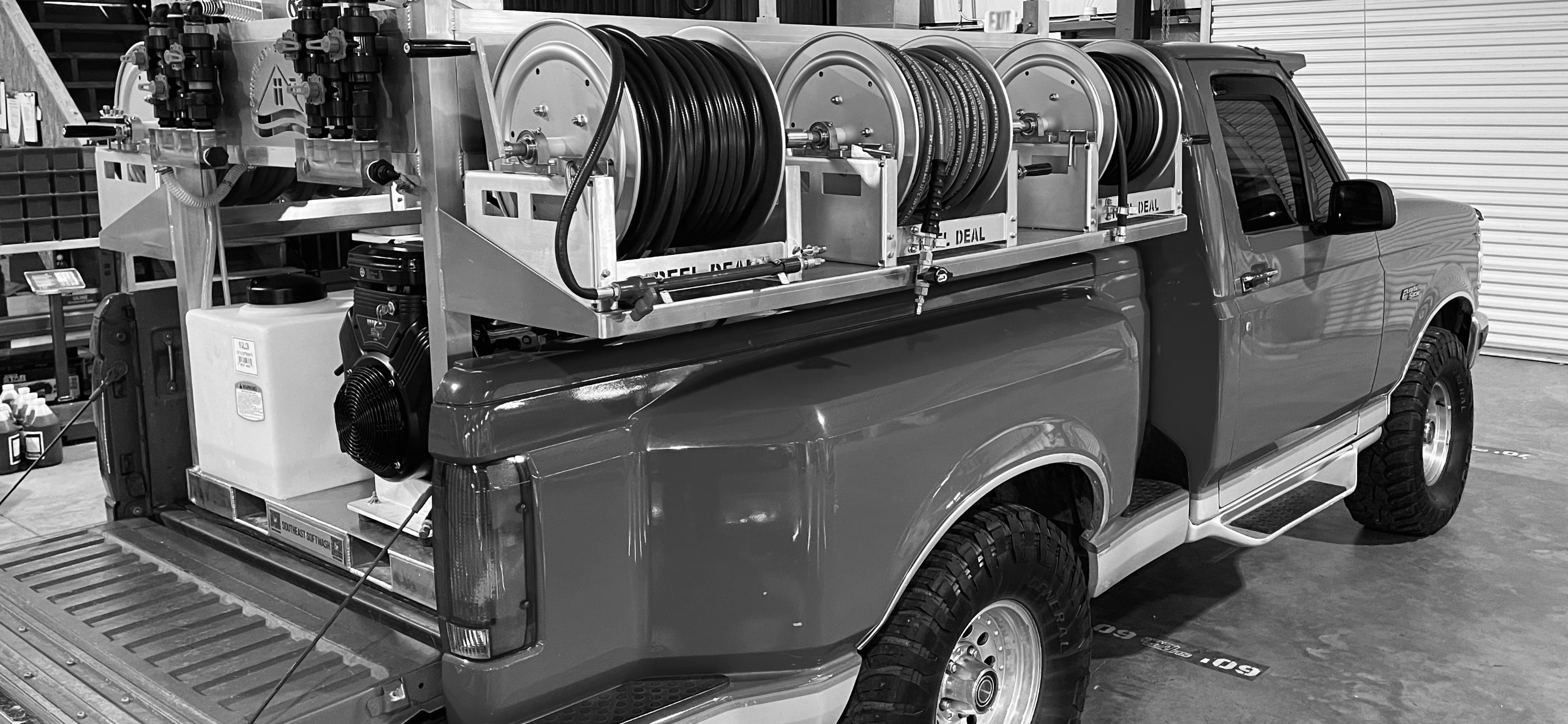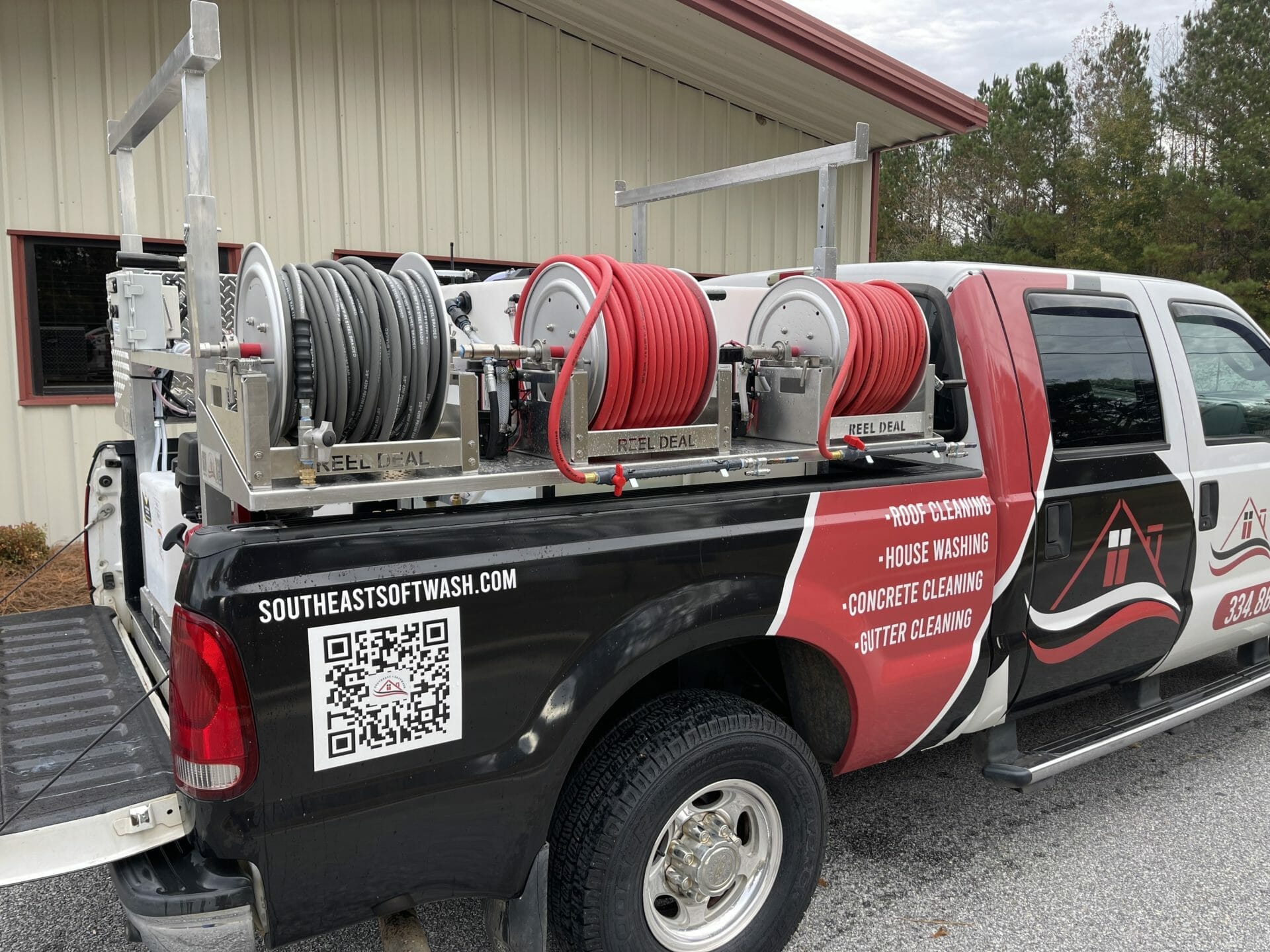 - 200' of softwash hose on a 18” Reel Big Deal hose reel.