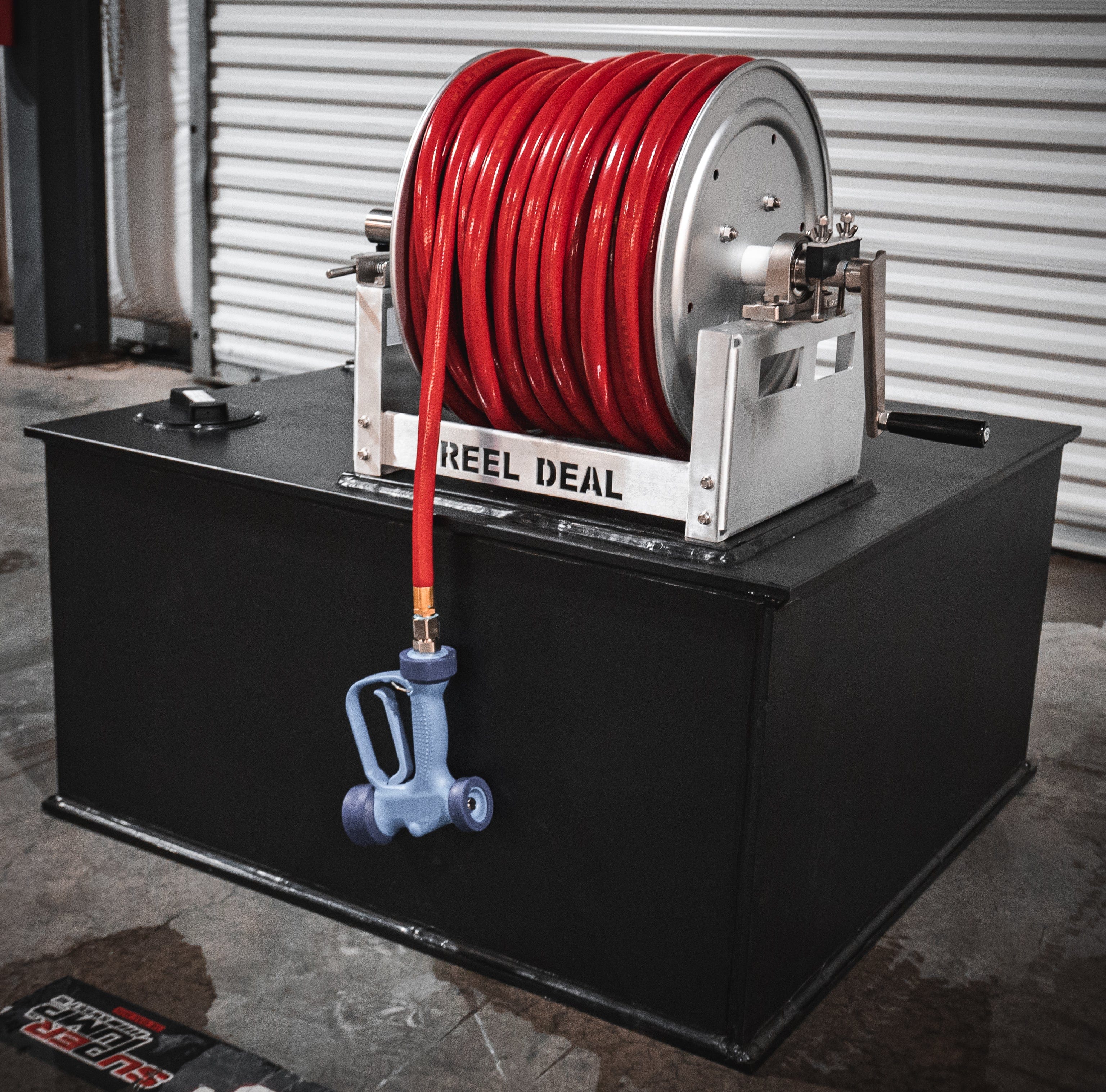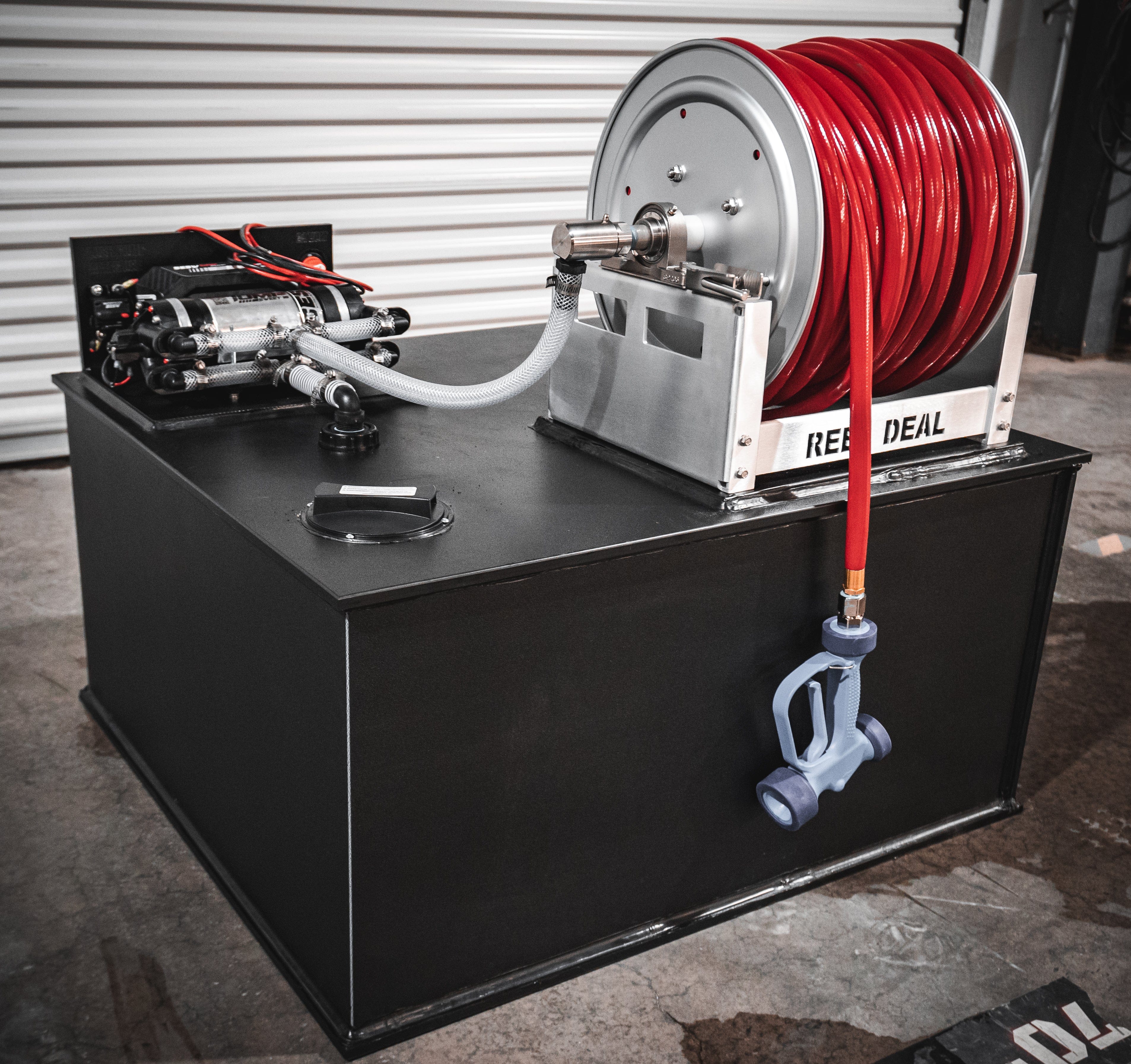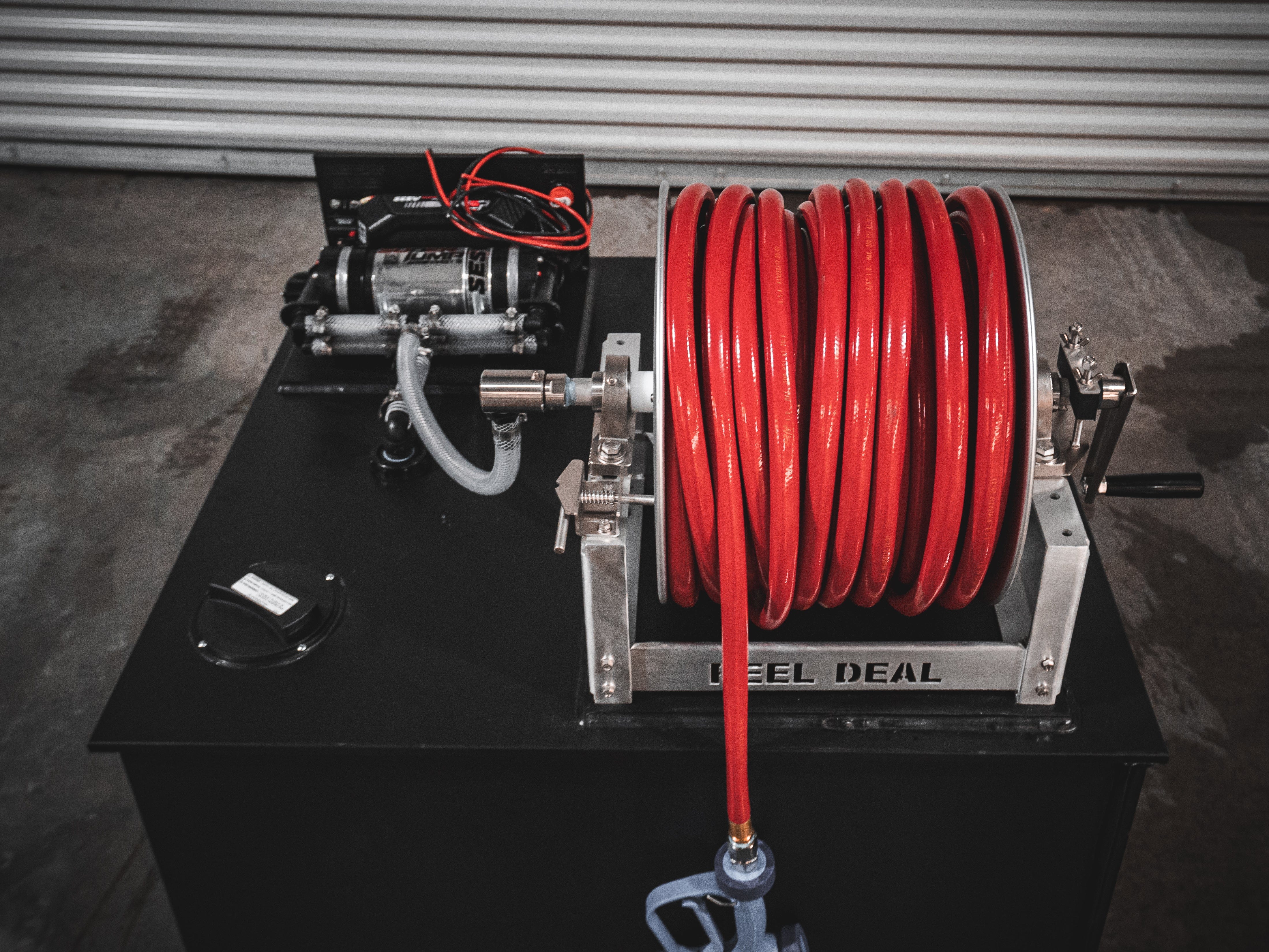Unit comes with a 100 gallon tank, Super 8 or Sweet 16 soft-wash pump, hose, trigger gun, and REEL DEAL hose reel.