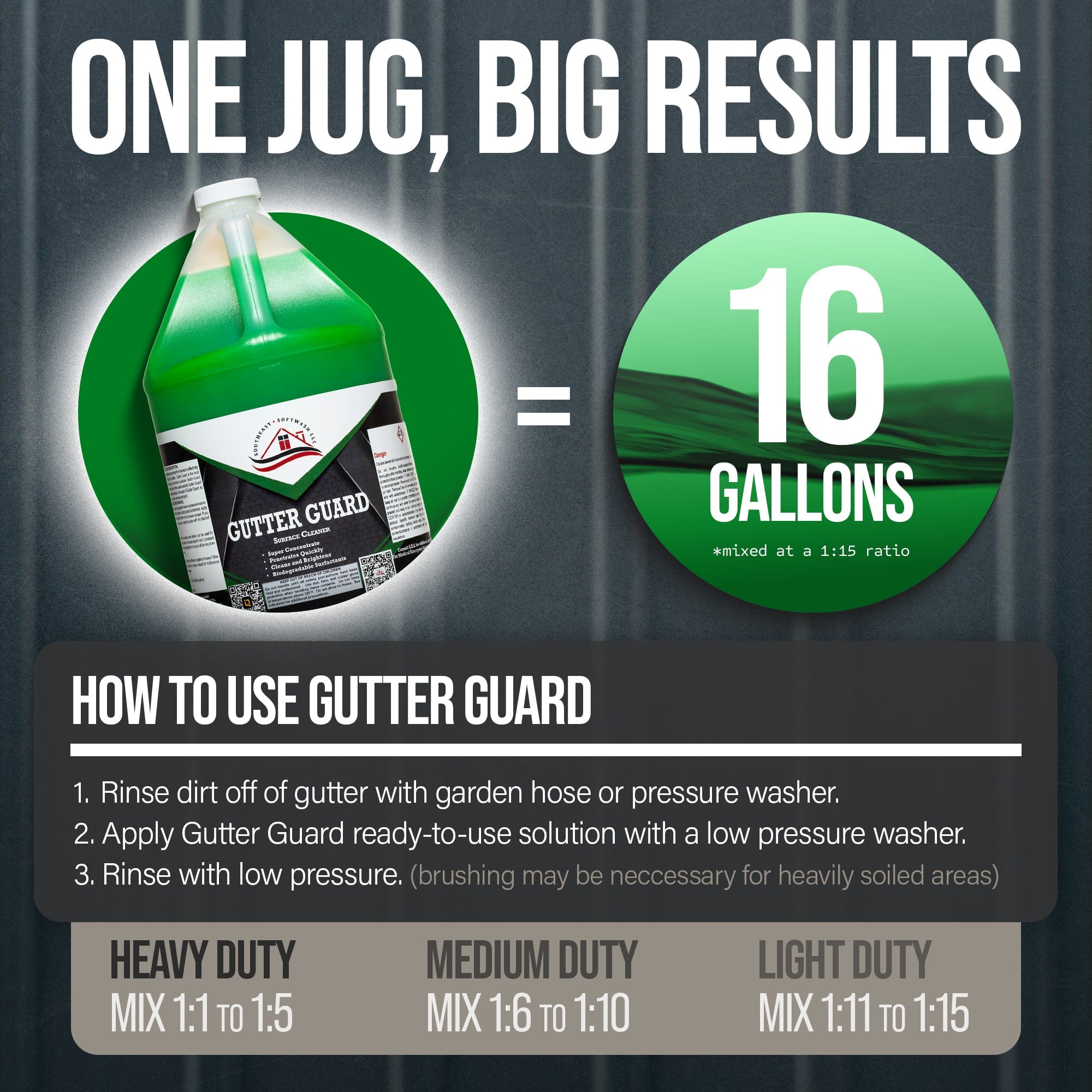 This Gutter Guard gutter cleaning chemical is super concentrated, which makes it attractive for shipping and cost-efficient. Dilute Gutter Guard two parts water to one part product, or up to three parts water to one part product.