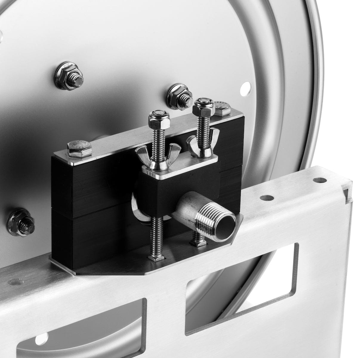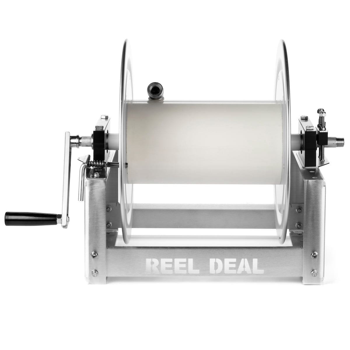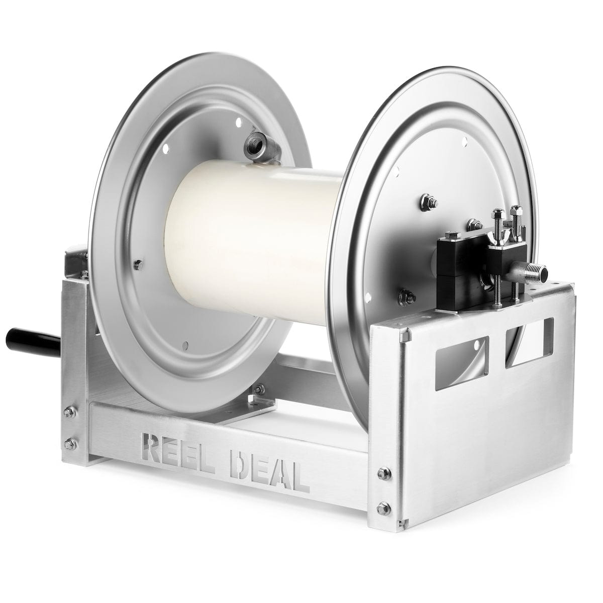 The REEL DEAL™ from Southeast Softwash is a rock solid, 12" hose reel, perfect for all things washing. Its large capacity means it'll hold more hose, and more is always better. The 316 Stainless fully welded internal manifold boasts a 3/4" internal diameter for high flow rates. Full frame design, with welded corners means rock solid reliability. The stainless pillow block, greasable bearings are overkill, but hey why not do it right? Stainless locking pin, and rubber brake complete the ensemble. These Reels come with our super tough 3/4" SKUNK SWIVEL!